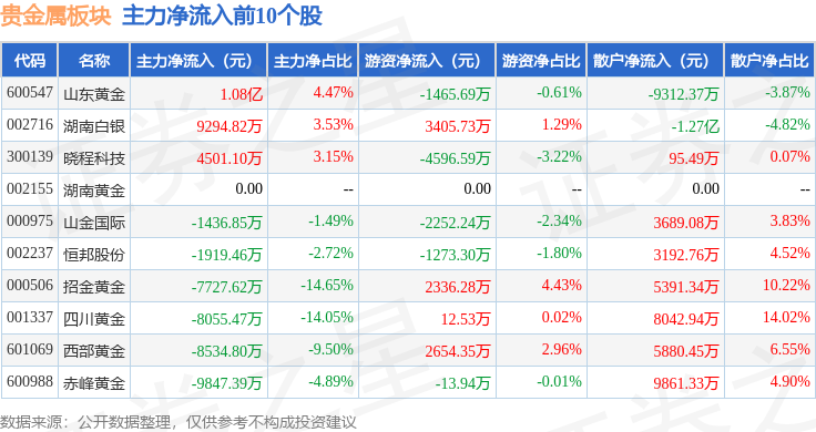 从资金流向上来看,当日贵金属板块主力资金净流出2.29亿元,游资资金净流入4377.11万元,散户资金净流入1.85亿元。贵金属板块个股资金流向见下表:
