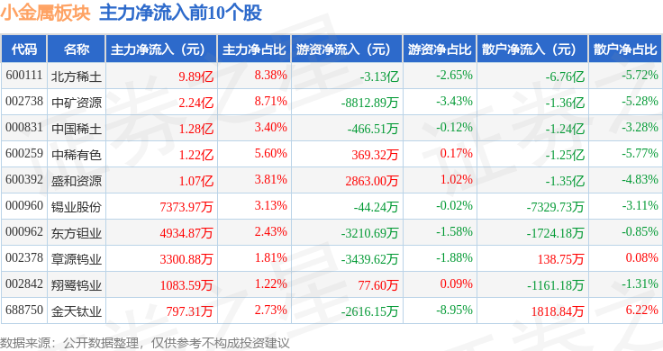 从资金流向上来看,当日小金属板块主力资金净流入2.53亿元,游资资金净流入4535.17万元,散户资金净流出2.98亿元。小金属板块个股资金流向见下表:
