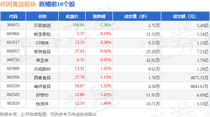 证券之星消息,1月12日休闲食品板块较上一交易日上涨0.75%,三只松鼠领涨。当日上证指数报收于4165.29,上涨1.09%。深证成指报收于14366.91,上涨1.75%。休闲食品板块个股涨跌见下表: