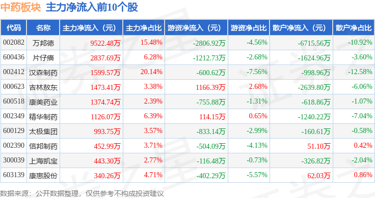 从资金流向上来看,当日中药板块主力资金净流出5.5亿元,游资资金净流入9065.71万元,散户资金净流入4.6亿元。中药板块个股资金流向见下表: