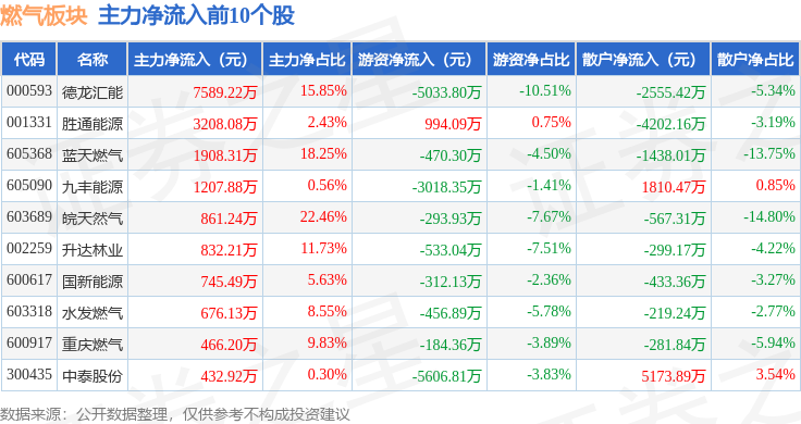 从资金流向上来看,当日燃气板块主力资金净流出9750.18万元,游资资金净流出1.34亿元,散户资金净流入2.32亿元。燃气板块个股资金流向见下表: