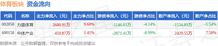 从资金流向上来看,当日体育板块主力资金净流入3131.78万元,游资资金净流出4017.44万元,散户资金净流入885.66万元。体育板块个股资金流向见下表: