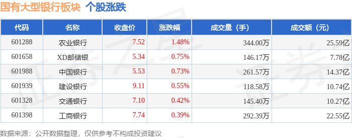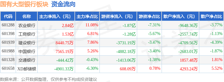 从资金流向上来看,当日国有大型银行板块主力资金净流入5.44亿元,游资资金净流出4.09亿元,散户资金净流出1.34亿元。国有大型银行板块个股资金流向见下表: