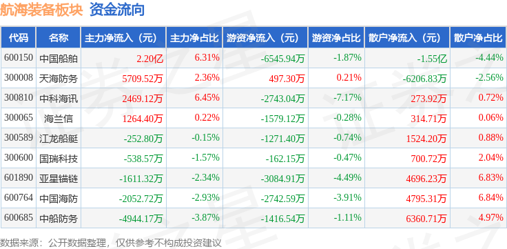 从资金流向上来看,当日航海装备板块主力资金净流入2.21亿元,游资资金净流出1.9亿元,散户资金净流出3041.32万元。航海装备板块个股资金流向见下表: