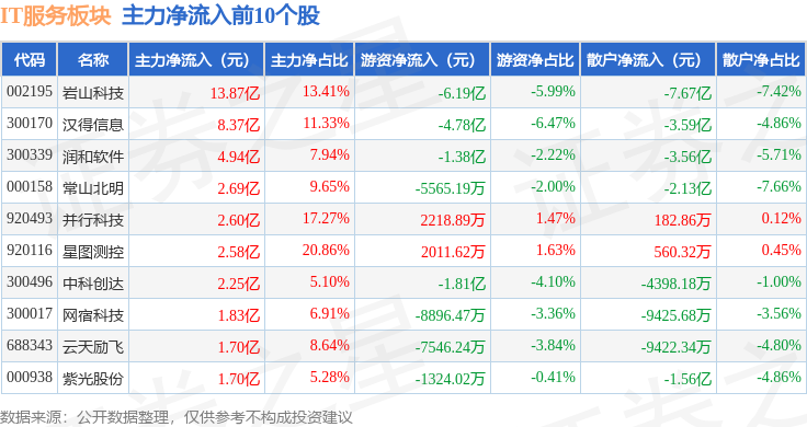 从资金流向上来看,当日IT服务板块主力资金净流入43.39亿元,游资资金净流出25.67亿元,散户资金净流出17.72亿元。IT服务板块个股资金流向见下表: