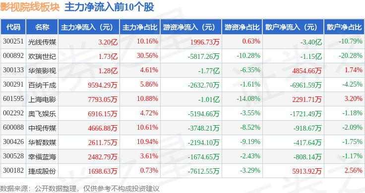 从资金流向上来看,当日影视院线板块主力资金净流入7.22亿元,游资资金净流出5.16亿元,散户资金净流出2.06亿元。影视院线板块个股资金流向见下表: