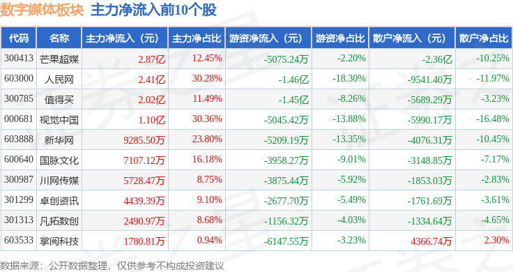 从资金流向上来看,当日数字媒体板块主力资金净流入11.44亿元,游资资金净流出6.2亿元,散户资金净流出5.24亿元。数字媒体板块个股资金流向见下表: