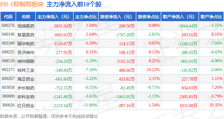 从资金流向上来看,当日PD-1抑制剂板块主力资金净流出6.41亿元,游资资金净流入1.79亿元,散户资金净流入4.63亿元。PD-1抑制剂板块个股资金流向见下表: