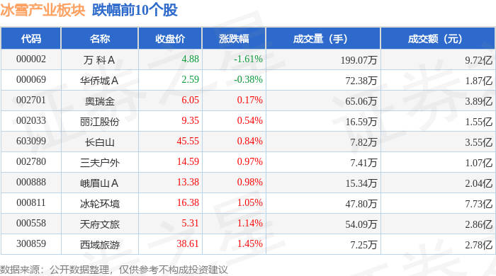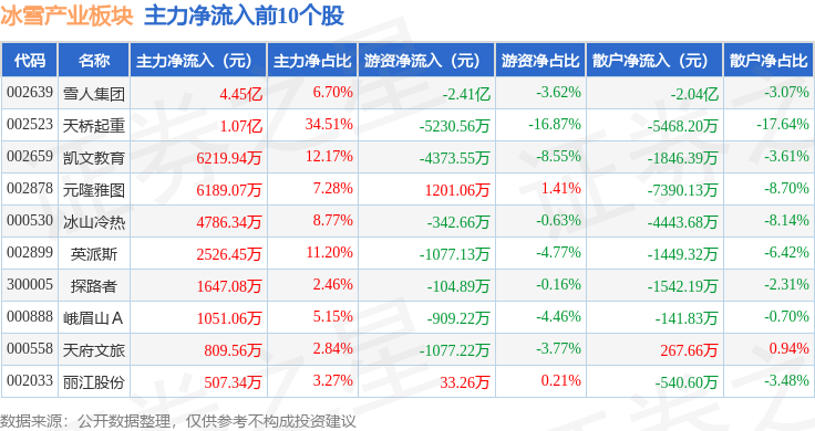 从资金流向上来看,当日冰雪产业板块主力资金净流入5.45亿元,游资资金净流出3.36亿元,散户资金净流出2.09亿元。冰雪产业板块个股资金流向见下表: