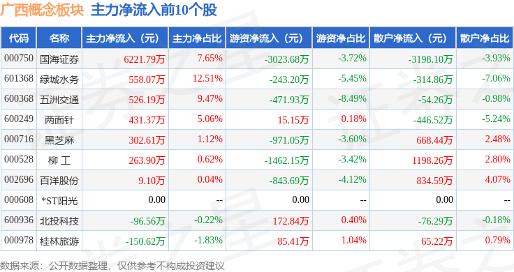 从资金流向上来看,当日广西概念板块主力资金净流出4.89亿元,游资资金净流出2985.18万元,散户资金净流入5.19亿元。广西概念板块个股资金流向见下表: