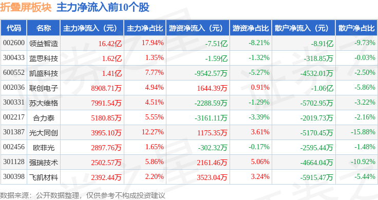 从资金流向上来看,当日折叠屏板块主力资金净流出21.47亿元,游资资金净流入3.27亿元,散户资金净流入18.2亿元。折叠屏板块个股资金流向见下表:
