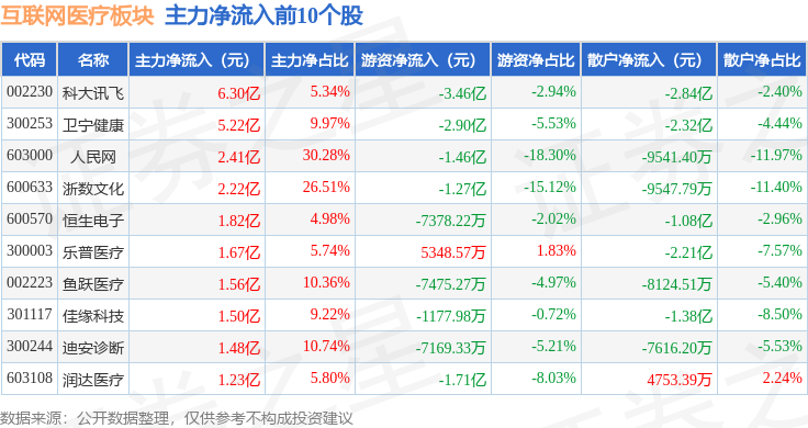 从资金流向上来看,当日互联网医疗板块主力资金净流入24.96亿元,游资资金净流出18.17亿元,散户资金净流出6.8亿元。互联网医疗板块个股资金流向见下表: