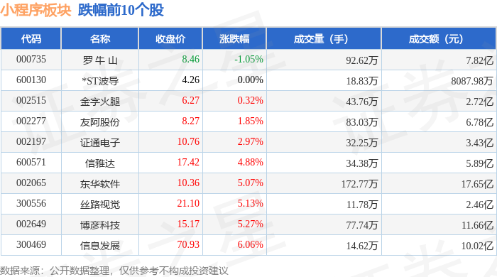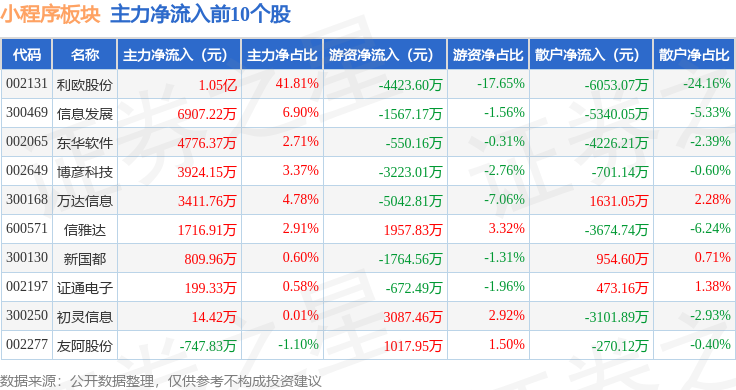 从资金流向上来看,当日小程序板块主力资金净流入1.36亿元,游资资金净流出8365.51万元,散户资金净流出5206.15万元。小程序板块个股资金流向见下表:
