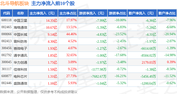 从资金流向上来看,当日北斗导航板块主力资金净流入33.29亿元,游资资金净流出24.98亿元,散户资金净流出8.31亿元。北斗导航板块个股资金流向见下表: