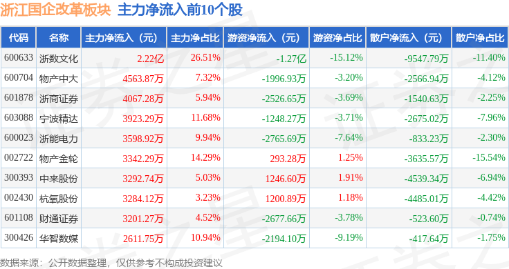 从资金流向上来看,当日浙江国企改革板块主力资金净流出1.97亿元,游资资金净流出1.05亿元,散户资金净流入3.02亿元。浙江国企改革板块个股资金流向见下表: