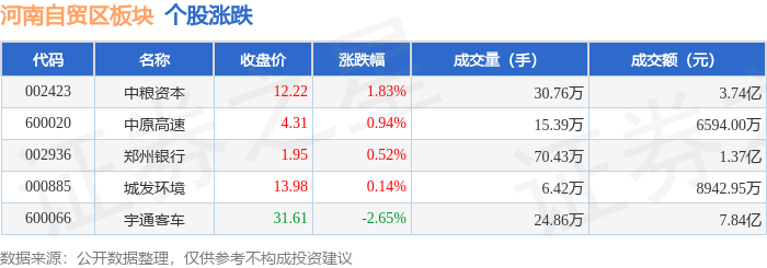 证券之星消息,1月12日河南自贸区板块较上一交易日下跌0.93%,宇通客车领跌。当日上证指数报收于4165.29,上涨1.09%。深证成指报收于14366.91,上涨1.75%。河南自贸区板块个股涨跌见下表: