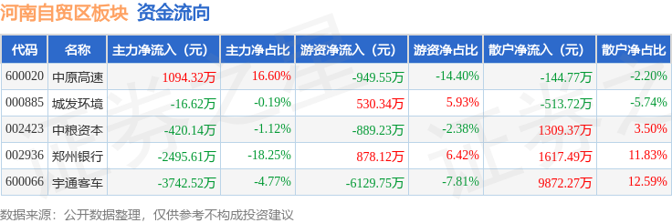 从资金流向上来看,当日河南自贸区板块主力资金净流出5580.57万元,游资资金净流出6560.07万元,散户资金净流入1.21亿元。河南自贸区板块个股资金流向见下表: