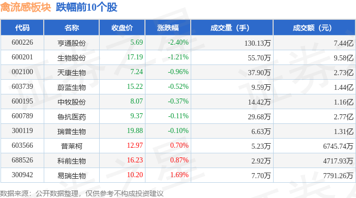 证券之星消息,1月12日禽流感板块较上一交易日下跌0.56%,亨通股份领跌。当日上证指数报收于4165.29,上涨1.09%。深证成指报收于14366.91,上涨1.75%。禽流感板块个股涨跌见下表: