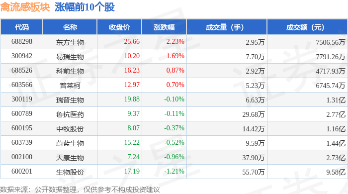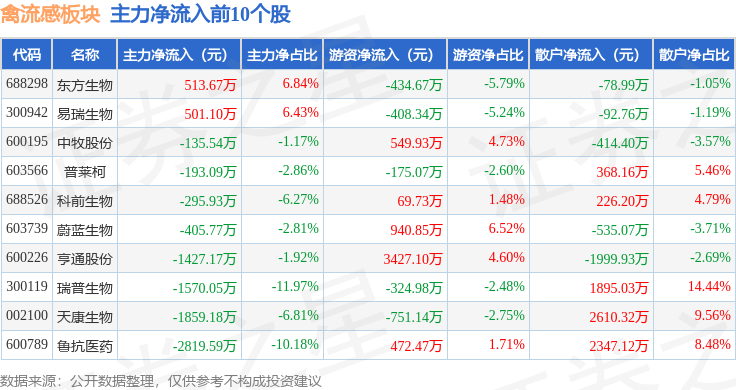 从资金流向上来看,当日禽流感板块主力资金净流出1.17亿元,游资资金净流入5324.62万元,散户资金净流入6420.34万元。禽流感板块个股资金流向见下表:
