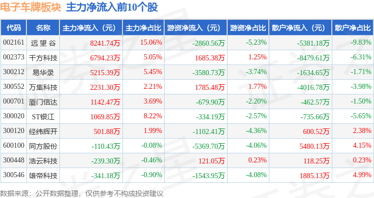 从资金流向上来看,当日电子车牌板块主力资金净流入1.18亿元,游资资金净流出1.48亿元,散户资金净流入3039.25万元。电子车牌板块个股资金流向见下表:
