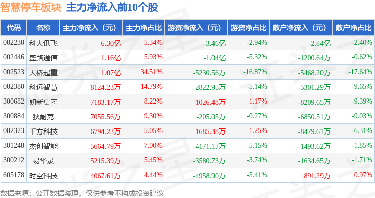 从资金流向上来看,当日智慧停车板块主力资金净流入10.21亿元,游资资金净流出7.13亿元,散户资金净流出3.08亿元。智慧停车板块个股资金流向见下表: