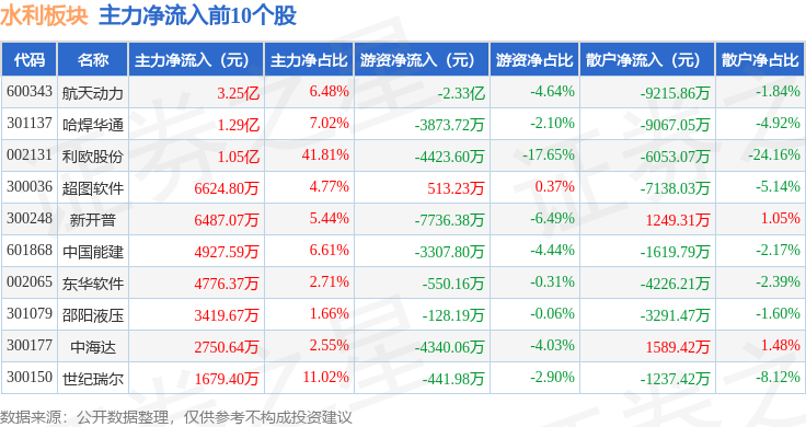 从资金流向上来看,当日水利板块主力资金净流出3.87亿元,游资资金净流出3.31亿元,散户资金净流入7.18亿元。水利板块个股资金流向见下表: