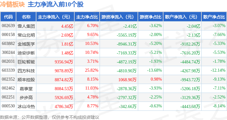 从资金流向上来看,当日冷链板块主力资金净流出16.4亿元,游资资金净流入1.28亿元,散户资金净流入15.12亿元。冷链板块个股资金流向见下表: