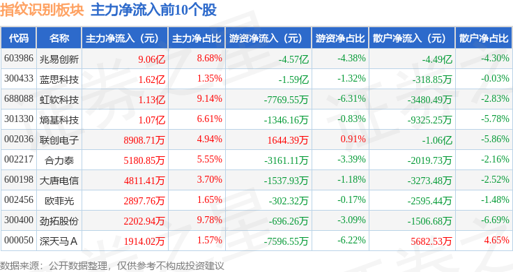 从资金流向上来看,当日指纹识别板块主力资金净流入12.49亿元,游资资金净流出6.56亿元,散户资金净流出5.93亿元。指纹识别板块个股资金流向见下表: