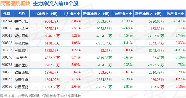 从资金流向上来看,当日民营医院板块主力资金净流出8.57亿元,游资资金净流出1.22亿元,散户资金净流入9.79亿元。民营医院板块个股资金流向见下表: