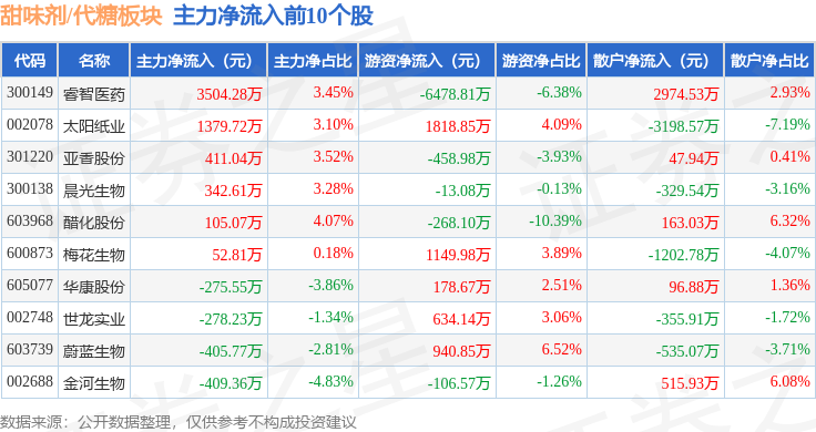 从资金流向上来看,当日甜味剂/代糖板块主力资金净流出2.12亿元,游资资金净流入448.54万元,散户资金净流入2.08亿元。甜味剂/代糖板块个股资金流向见下表: