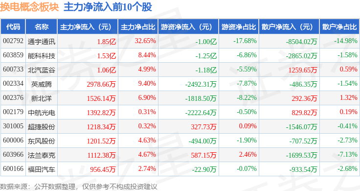 从资金流向上来看,当日换电概念板块主力资金净流出9.52亿元,游资资金净流出2334.27万元,散户资金净流入9.76亿元。换电概念板块个股资金流向见下表: