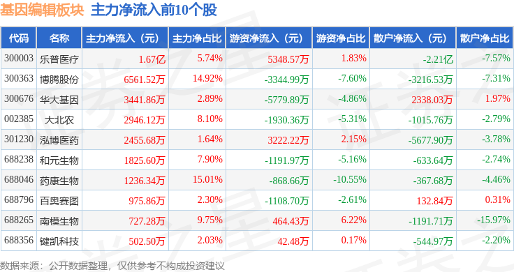 从资金流向上来看,当日基因编辑板块主力资金净流入7622.72万元,游资资金净流出53.96万元,散户资金净流出7568.76万元。基因编辑板块个股资金流向见下表: