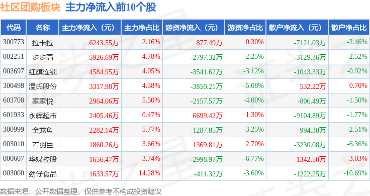 从资金流向上来看,当日社区团购板块主力资金净流入4505.27万元,游资资金净流出6789.6万元,散户资金净流入2284.33万元。社区团购板块个股资金流向见下表:
