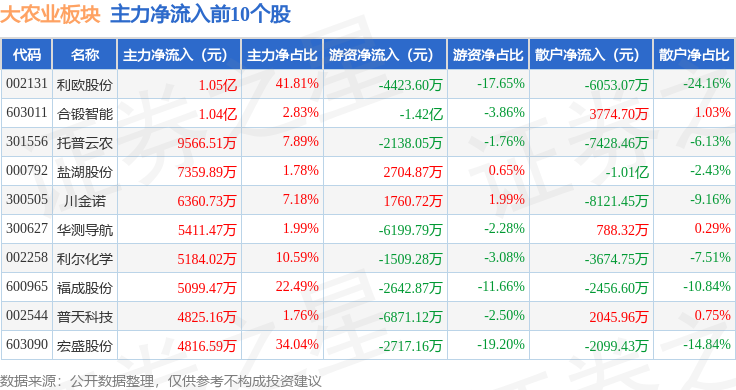 从资金流向上来看,当日大农业板块主力资金净流出20.23亿元,游资资金净流入9132.37万元,散户资金净流入19.32亿元。大农业板块个股资金流向见下表: