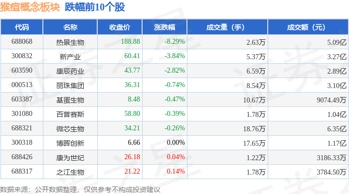 从资金流向上来看,当日猴痘概念板块主力资金净流入2.99亿元,游资资金净流出2.9亿元,散户资金净流出957.22万元。猴痘概念板块个股资金流向见下表: