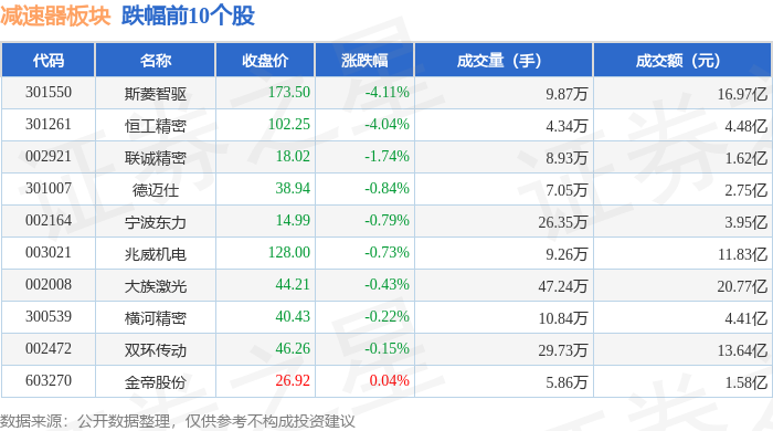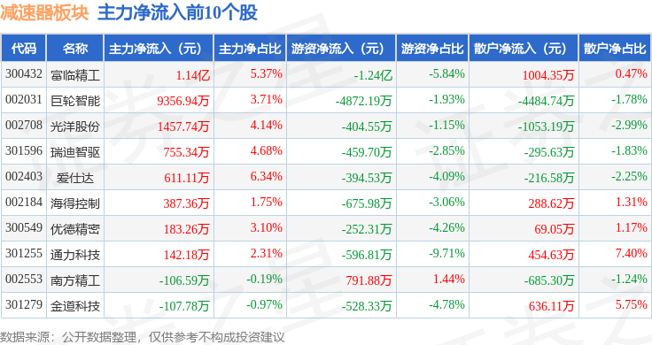 从资金流向上来看,当日减速器板块主力资金净流出11.95亿元,游资资金净流入2.18亿元,散户资金净流入9.76亿元。减速器板块个股资金流向见下表: