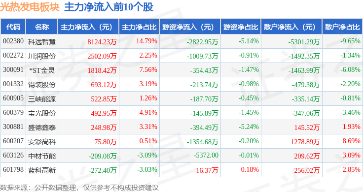 从资金流向上来看,当日光热发电板块主力资金净流出2.21亿元,游资资金净流出1.01亿元,散户资金净流入3.22亿元。光热发电板块个股资金流向见下表: