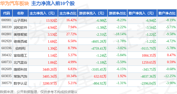 从资金流向上来看,当日华为汽车板块主力资金净流出10.07亿元,游资资金净流出8.02亿元,散户资金净流入18.09亿元。华为汽车板块个股资金流向见下表: