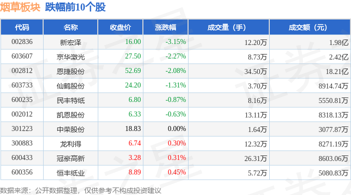 证券之星消息,1月12日烟草板块较上一交易日上涨2.08%,慧辰股份领涨。当日上证指数报收于4165.29,上涨1.09%。深证成指报收于14366.91,上涨1.75%。烟草板块个股涨跌见下表: