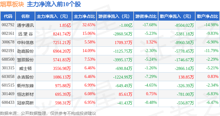 从资金流向上来看,当日烟草板块主力资金净流入1.51亿元,游资资金净流出1.04亿元,散户资金净流出4680.07万元。烟草板块个股资金流向见下表: