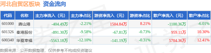 从资金流向上来看,当日河北自贸区板块主力资金净流出6858.96万元,游资资金净流入1295.85万元,散户资金净流入5563.12万元。河北自贸区板块个股资金流向见下表: