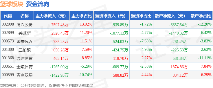 从资金流向上来看,当日篮球板块主力资金净流入9334.56万元,游资资金净流出2868.06万元,散户资金净流出6466.5万元。篮球板块个股资金流向见下表: