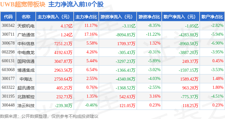 从资金流向上来看,当日UWB超宽带板块主力资金净流出2.62亿元,游资资金净流出6.53亿元,散户资金净流入9.15亿元。UWB超宽带板块个股资金流向见下表: