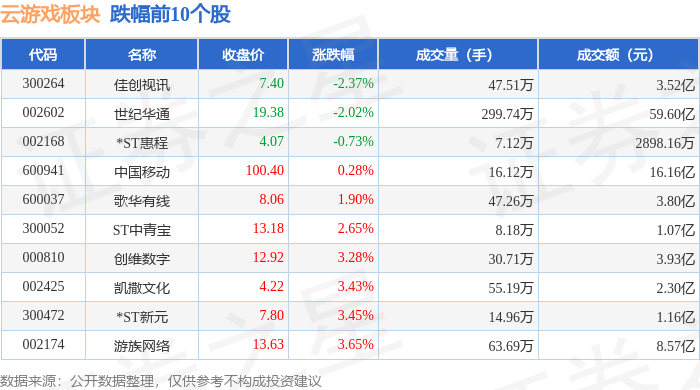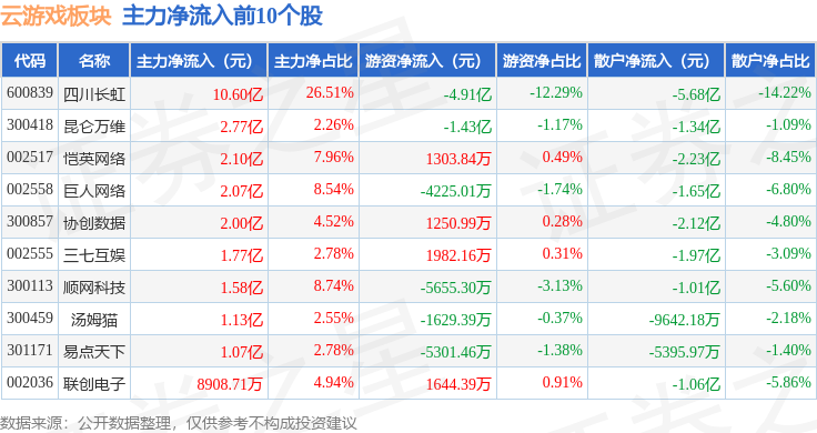 从资金流向上来看,当日云游戏板块主力资金净流入17.68亿元,游资资金净流出7.15亿元,散户资金净流出10.52亿元。云游戏板块个股资金流向见下表: