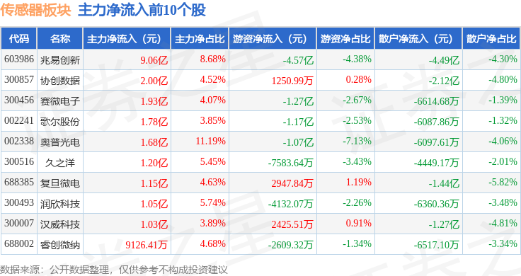 从资金流向上来看,当日传感器板块主力资金净流出21.04亿元,游资资金净流入8.33亿元,散户资金净流入12.71亿元。传感器板块个股资金流向见下表: