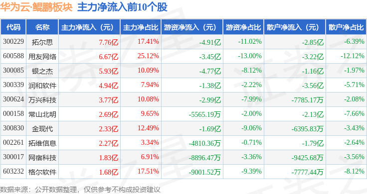 从资金流向上来看,当日华为云·鲲鹏板块主力资金净流入46.54亿元,游资资金净流出35.11亿元,散户资金净流出11.43亿元。华为云·鲲鹏板块个股资金流向见下表: