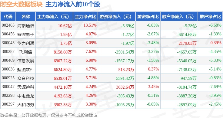 从资金流向上来看,当日时空大数据板块主力资金净流入12.74亿元,游资资金净流出8.08亿元,散户资金净流出4.65亿元。时空大数据板块个股资金流向见下表: