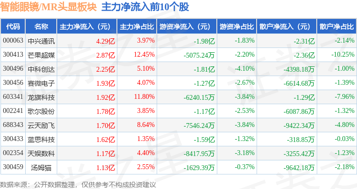 从资金流向上来看,当日智能眼镜/MR头显板块主力资金净流出30.31亿元,游资资金净流出3096.94万元,散户资金净流入30.62亿元。智能眼镜/MR头显板块个股资金流向见下表:
