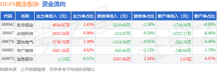 从资金流向上来看,当日HEPS概念板块主力资金净流出1.1亿元,游资资金净流入93.55万元,散户资金净流入1.09亿元。HEPS概念板块个股资金流向见下表: