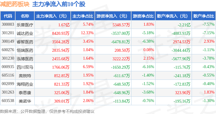 从资金流向上来看,当日减肥药板块主力资金净流出6.31亿元,游资资金净流入3.03亿元,散户资金净流入3.28亿元。减肥药板块个股资金流向见下表: